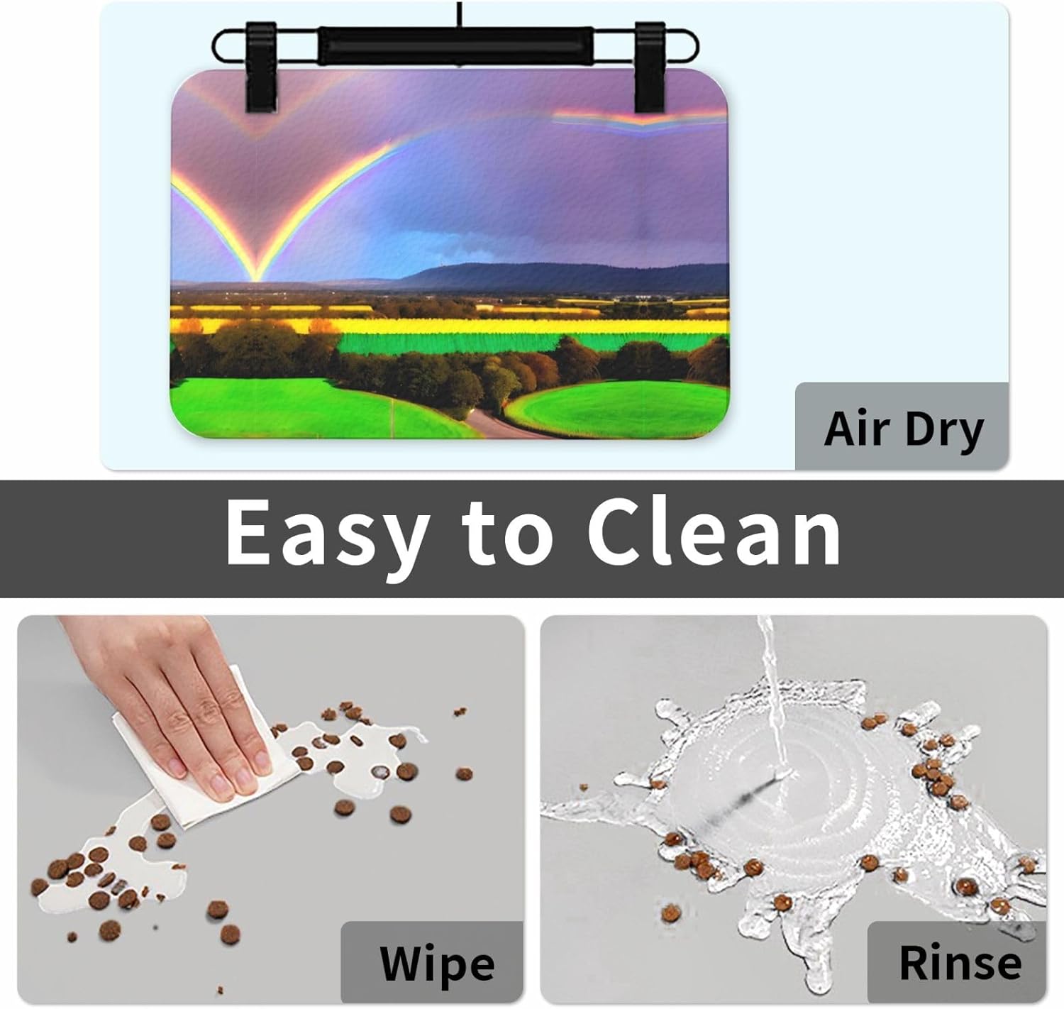 Product Description:Transform your pet's feeding experience with our advanced Evening Rainbow print Pet absorbent leather tablecloth. Engineered with a PU surface and waterproof rubber backing, this innovative design offers unparalleled performance. Super strong water absorption and quick drying ability, avoid getting your pet's paws wet and keep your pet's eating environment clean. Our pet Non-Slip mats come in 2 sizes and are perfect as a dog food mat or a cat food mat.30x45cm Evening Rainbow print pet feeding placemat :Small mat17.7" x 11.8". Large mat 23.6" x 15.7".The non-staining material ensures that no traces of food or water remain on the mat, keeping it looking fresh every time. Additionally, its foldable structure makes it easy to store or carry, while the non-slip rubber base keeps the mat steady during active feeding sessions. Elevate your pet's comfort and preserve your home's cleanliness with this reliable accessory.