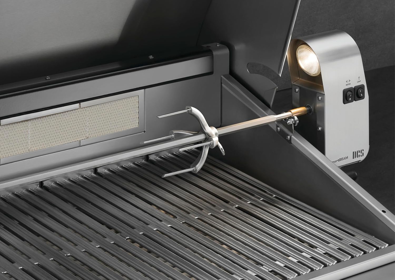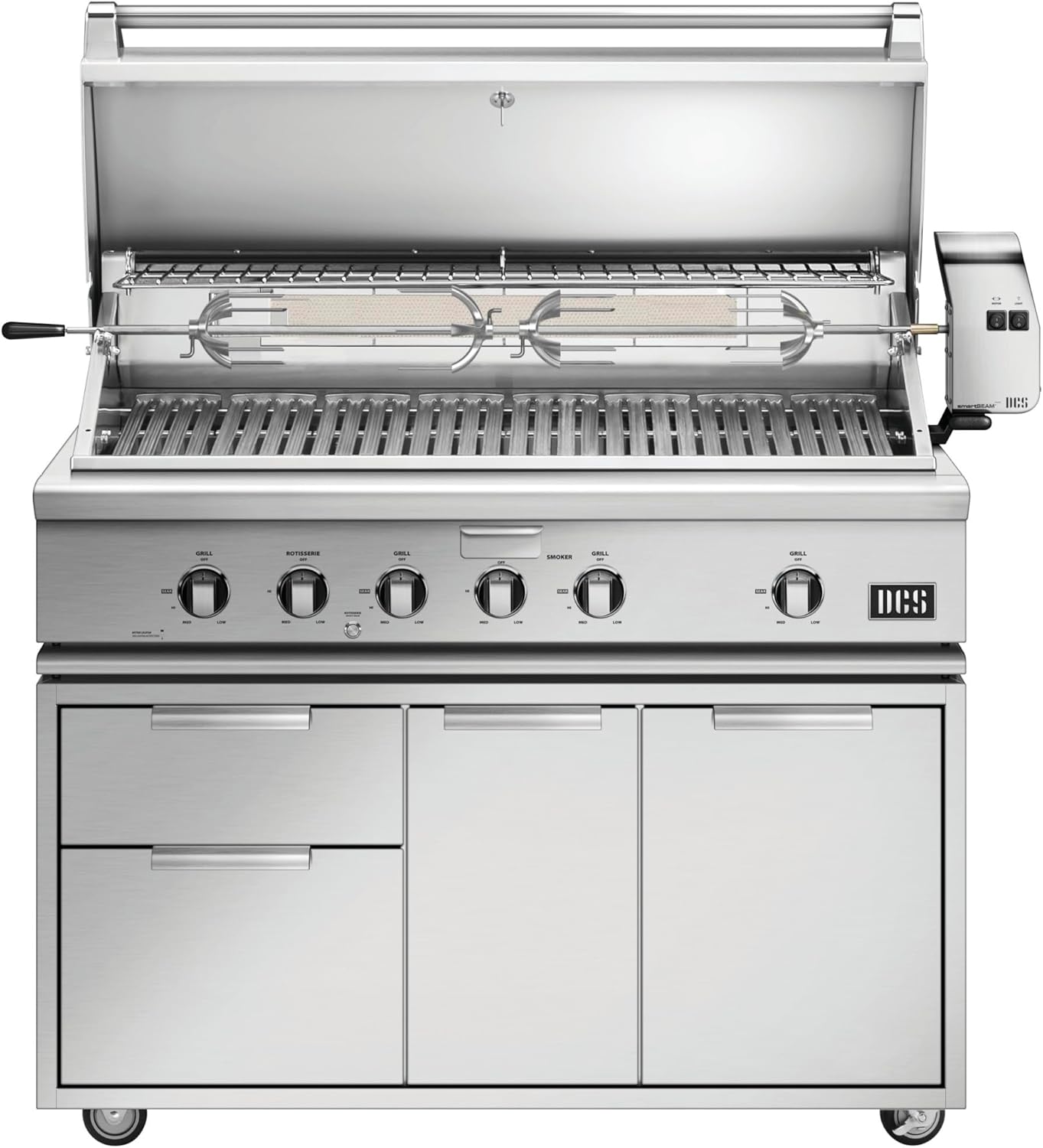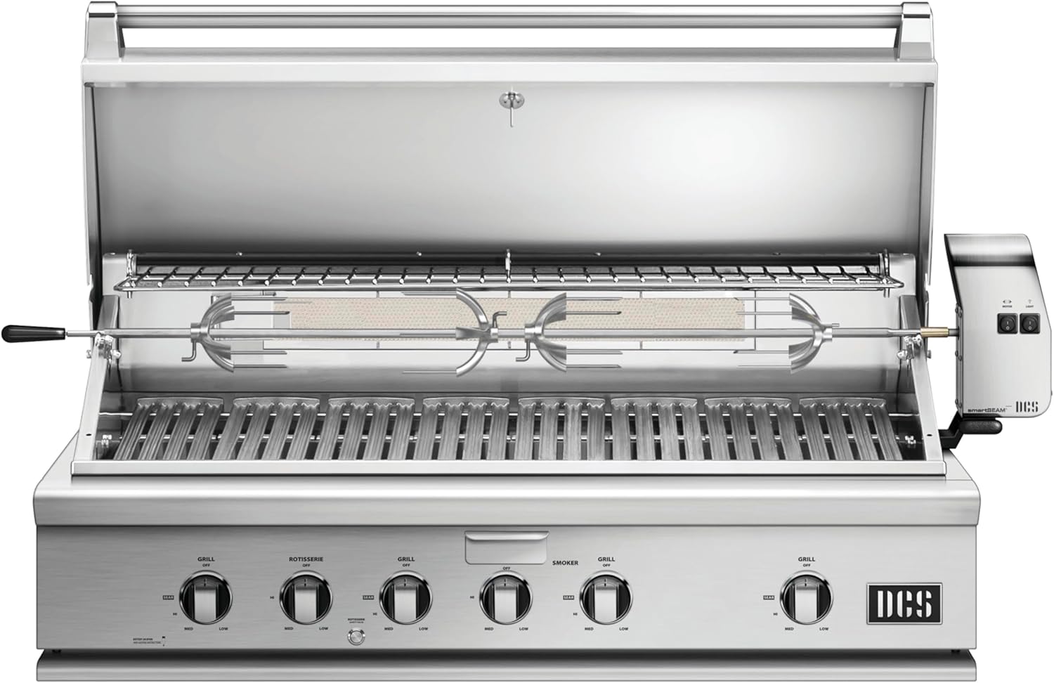 Features: Four 25,000 BTU U-burners One 18,000 BTU infrared rotisserie burner able to turn up to a 50 lb. load A dedicated smoker tray with a direct 3,500 BTU burner offering a , convenient option for specialized smoking recipes The precision ported U-shaped stainless steel burners offer premium and performance, and a heat shield directs heat upwards maximizing heating efficiency 1,182 sq. in. total cooking area Choose the precise heat you need from a low and slow 300° up to an intense 1100° allowing you the versatility to cook anything from vegetables, to your favorite fish or meat, to the perfect pizza Assembled by hand from heavy duty 304 grade stainless steel, inside and out, DCS grills are built to handle most everything Mother Nature can throw at them Start up the grill quickly and easily with the one-step direct burner ignition which lights the burners directly from the corresponding knobs Built-in temperature gauge lets you know exactly how hot the grill is, even when the hood is down Grill cart sold separately Covered under DCS Appliances' class-leading including 2 years full coverage for parts and labor and a limited on the grill burners, hood, cooking grates, burner box and racks Product Technologies: Ceramic Radiant Technology: A layer of ceramic rods provides intense yet even heat. It gives a consistent grilling surface, with controlled heat rather than direct fire. Smart Beam™ Grill Light: A halogen light is designed to illuminate the entire cooking surface for perfect night grilling. Grease Management System™ Grease Channeling Technology: This patented technology reduces flare-ups by directing grease and oils away from the burner flames during grilling. Specifications: BTU Output: 121500 Total Cooking Area: 1182 Sq. In. Number of Burners: 6 Control Type: Turn Knob Fuel Type: Natural Gas Burner Style: Infrared and Stainless Steel Height: 24-1/4" Width: 47-7/8" Depth: 26-7/8"