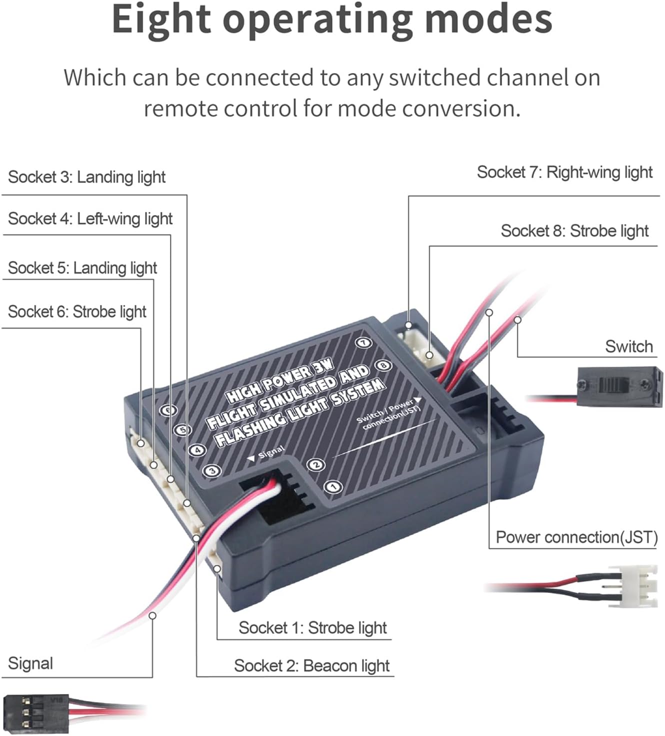 Features: This RC flight lighting system is the simulation of a large passenger airplane, helicopter,s and flighter public lighting group. Totally simulate the lights system of a real airplane. Low voltage detection, when the battery voltage is lower than 6.8V, all lights flashing. 8 operating modes, which can be connected to any switched channel on the remote control for mode conversion. Designed according to the standard of aircraft lights which makes your aircraft more realistic and shiny. 8 light group interface, red anti-collision lights, white flashing lights, navigation lights, landing lights.Specifications: Input voltage: 4.8-6V Working current: 1200mA LED cable length: 820mm Power cable length: 300mm Control box size: 55 * 52 * 9mmPackage Information: Package size: 14.5 * 9 * 4cm Package weight: 192g Brand gift box packagePackage List: 1 * Control Box 8 * LED Light 1 * English Manual 1 * Accessory Packet