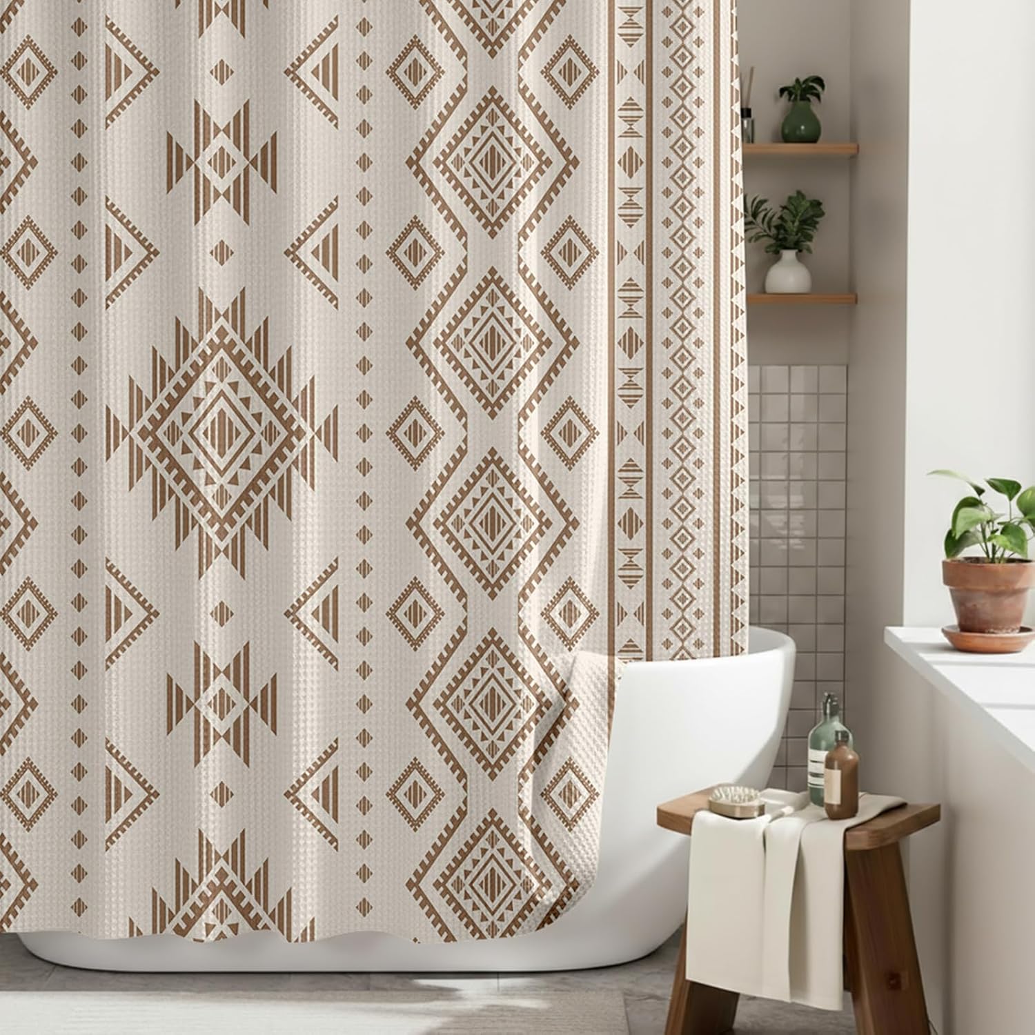 Features: Beyond its functional advantage, this shower curtain set serves as a stylish addition to your bathroom decor. The Western Bohemian geometric pattern effortlessly enhances your space, creating an inviting and aesthetic bathroom environment that complements your style. With rust proof plastic hooks and high quality fabric, this shower curtain set promises durability and long lasting appeal. Constructed to withstand daily wear and tear, it offers a reliable, steady performance while keeping your bathroom looking sleek and modern. Specifications: Material: polyester Color: beige, white Size: about 72 x 72 inches Package includes: 1 x Shower curtain 12 x Plastic hooks Notes: Manual measurement, please allow slight errors on size. The color may exist a slight difference due to different screen displays. Small parts included, please keep them away from little kids to avoid swallowing risk