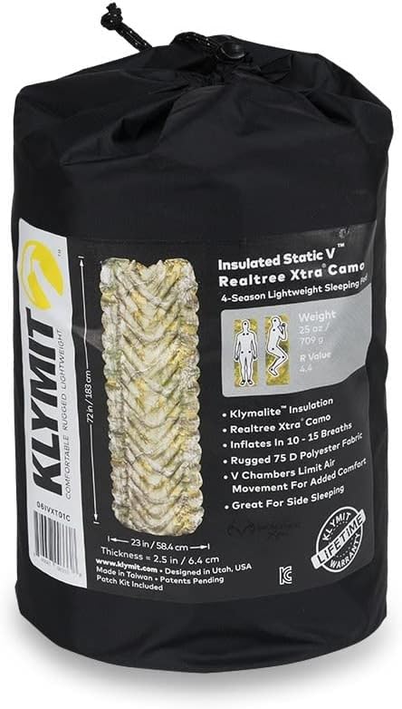 A comfortable backcountry pad providing winter insulation and all-season comfort, the Insulated Static V packs light and small and delivers an outstanding R-Value of 4.4. The body-mapped shape and V chamber design combine to maintain comfort and minimize air movement that can impact insulation. The chambers are filled with light, lofty Klymalite synthetic insulation to add another layer of protection from the cold ground, and dynamic side rails cradle you comfortably on your pad for a more restful sleep.