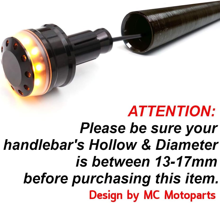 "IXENO" Bar Ends with LED Turn Signal Lighting For 13-17mm Internal Diameter Hollow Handlebar Brand New "IXENO" Bar Ends The Turn Signal light will turn on and flash only when you turn left or turn right. Because there are only two wires for connection. CNC High Grade Billet Aluminum & Hard Anodized Matt Transparent LED Ring & 10 Dots Lighting Design Improve Visibility at Night Great as an Extra Light source Fit for 13-17mm Diameter handlebar Wire Length: 100cm (Durable, Heat / Oil Resistant) Easy Installation QTY: 1 Pair (Left & Right) May need a little bit modification on the handlebar if you handlebar is not in hollow *** Please make sure that your handlebar is hollow in order to let the wires pass through the tube, thanks!*** Remarks: This product was taken in kind, due to camera, light, display parameters and other factors, there may have color aberration. If you would like to clarify the color tone, please kindly contact us for details. Thanks! Trademark Disclaimer: This listing products are not sponsored or endorsed by, or affiliated with the brands its parts fit. All product brands, logos, vehicle makes/models and names are properties of their respective owners. MC MOTOPARTS is the trademark of MC Moto Company Limited.