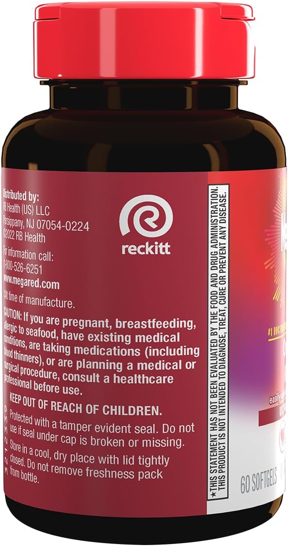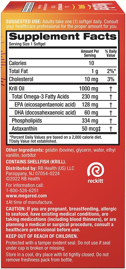 "MegaRed is the #1 Doctor Recommended Krill Oil Brand for heart health. ANTARCTIC KRILL OIL: Krill is one of the world’s most abundant and sustainable organisms. MegaRed only sources krill from the Antarctic where krill is most abundant. OMEGA 3 SUPPLEMENT: MegaRed Omega 3 Krill Oil has been shown to significantly increase your omega 3 index. Supportive, but not conclusive research shows that consumption of EPA and DHA Omega-3. HEART HEALTH: MegaRed Krill Oil Omega 3 fatty acid supplements provide a significant level of omega-3 fatty acids to support heart health in a once daily softgel. NO FISHY AFTERTASTE and EASY ABSORPTION: Krill Oil is carried in a phospholipid form which can be easily absorbed by the human body and because it's krill oil as opposed to fish oil, MegaRed Krill Oil has no fishy aftertaste or odor. 2X MORE OMEGA 3: One 1000mg MegaRed Ultra Concentrated softgel equals to two 500mg standard krill oil softgels1. These statements have not been evaluated by the Food and Drug Administration. This product is not intended to diagnose, treat, cure or prevent any disease. 1Total Omega-3 Fatty Acids of 225 mg "