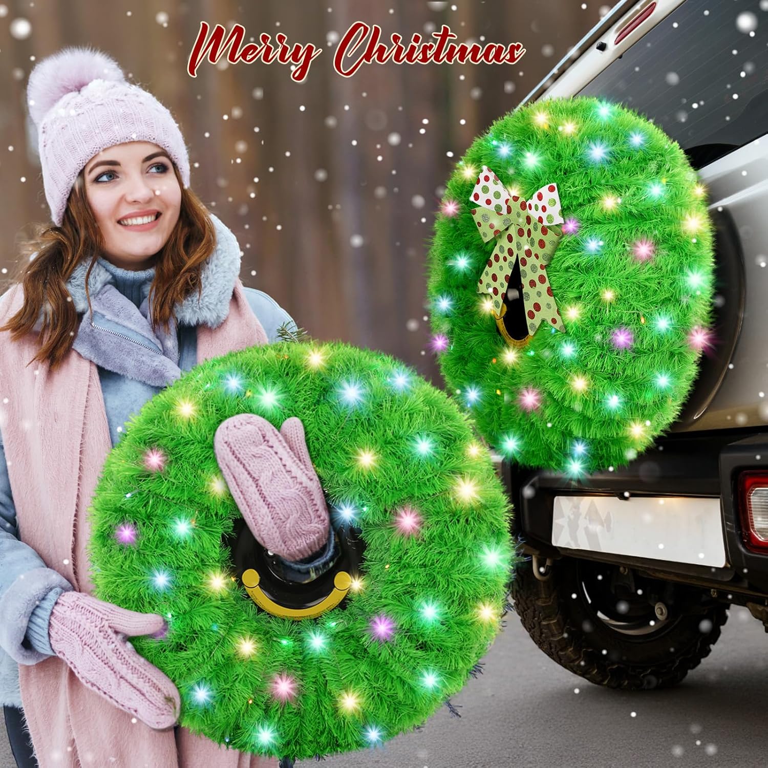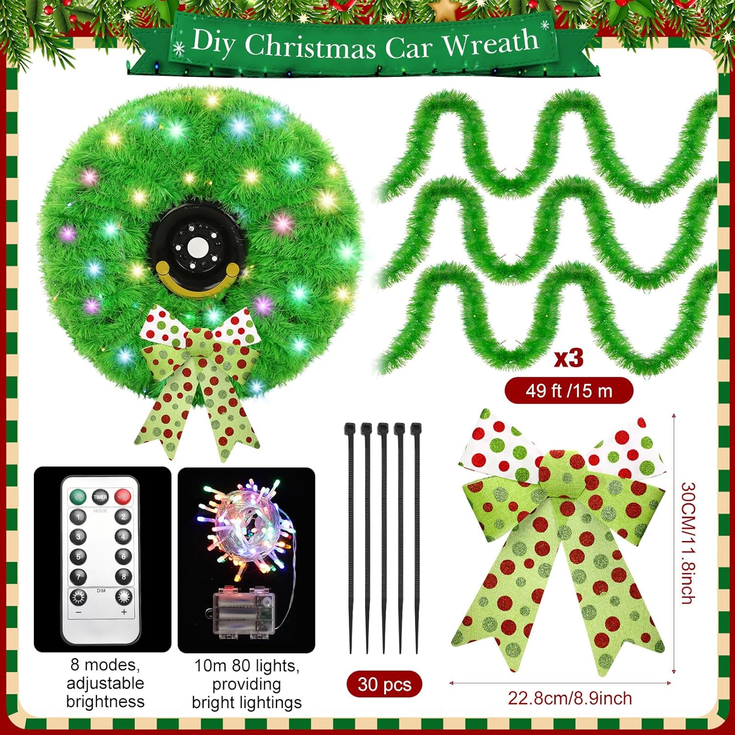 Features: Repeating Decoration: You only need to disassemble and save the garland set, then you can decorate anywhere you want as many times as you want, and the light string can use many times by replacing the batteries. Ideal Gift: This garland can also use with other decorations, such as flashing lights, Christmas hats, bells, and is an ideal gift for decorating various occasions and giving to car owners. Specifications: Bow material: polyester, PVC Garland material: tinsel Black cable ties: plastic Color: green Garland size: about 148 ft (3 piece) Bow size: about 8.9 x 11.8 inches Light string size: about 32.8 ft Package includes: 1 x Green wreath 1 x Green bow 1 x Colored light string 1 x Remote control 20 x Black cable tie Notes: Manual measurement, please allow slight errors on size. The color may exist a slight difference due to different screen displays