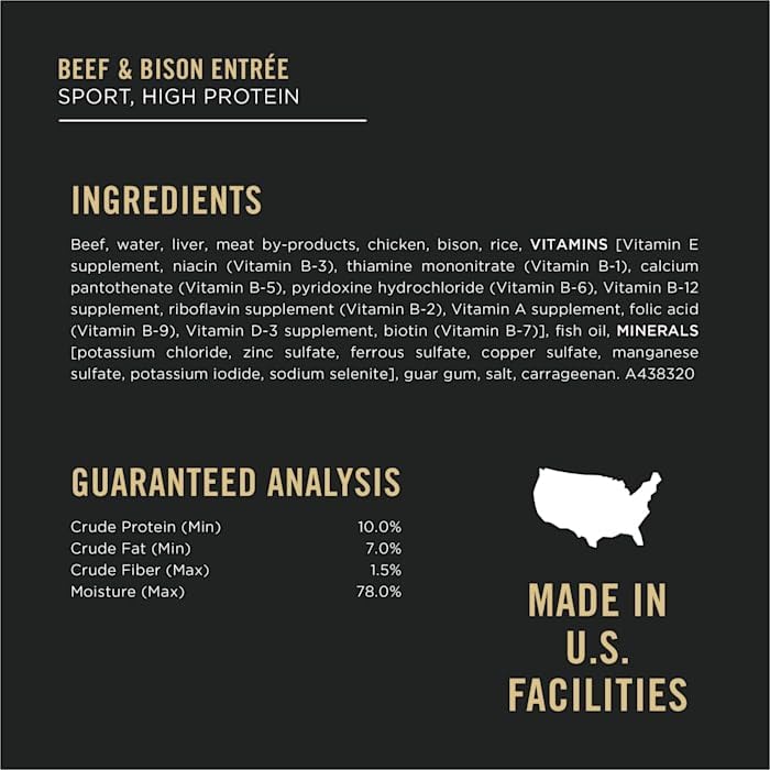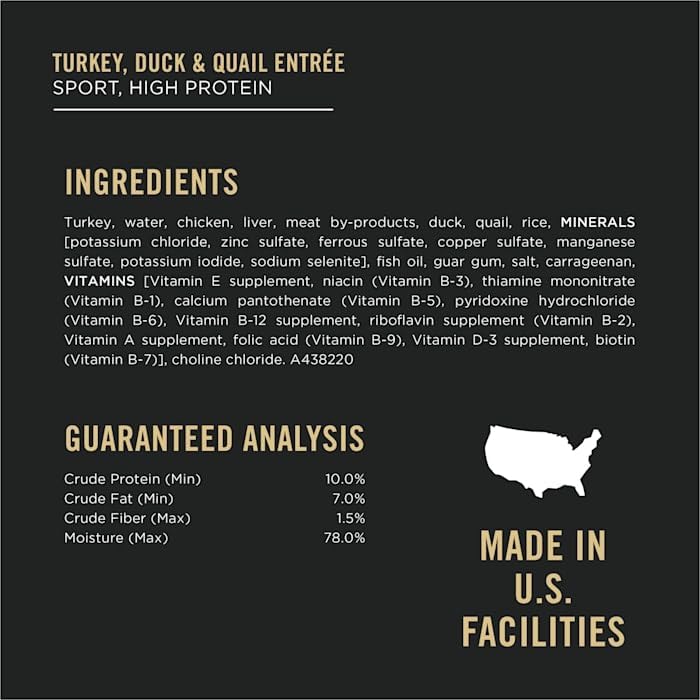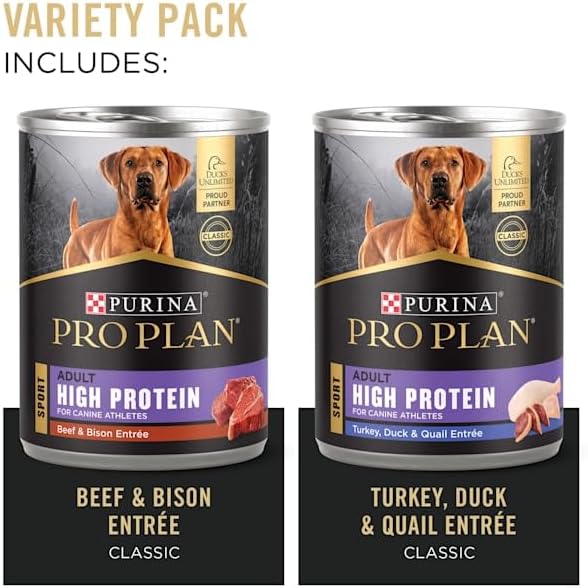 Pro Plan Sport High Protein Wet Dog Food Variety Pack delivers two delicious options to please your dog's novelty-seeking tastebuds. The pack includes two satisfying formulas, including Beef & Bison and Turkey, Duck & Quail options. And each formula features real meat or poultry as the first ingredients. It can be served between meals or as a dry dog food topper. Each serving of this novel protein dog food formula is 100 percent complete and balanced for your canine athlete and features 23 essential vitamins and nutrients to support his active lifestyle Plus, it has moisture to support healthy hydration to help your dog achieve his full athletic potential. Made with antioxidants, this concentrated formula also helps support a healthy immune system. Plus, Pro Plan Sport is the official performance dog food of Ducks Unlimited. So every time you feed this to your champion, you're offering him concentrated nutrition that fuels his best.