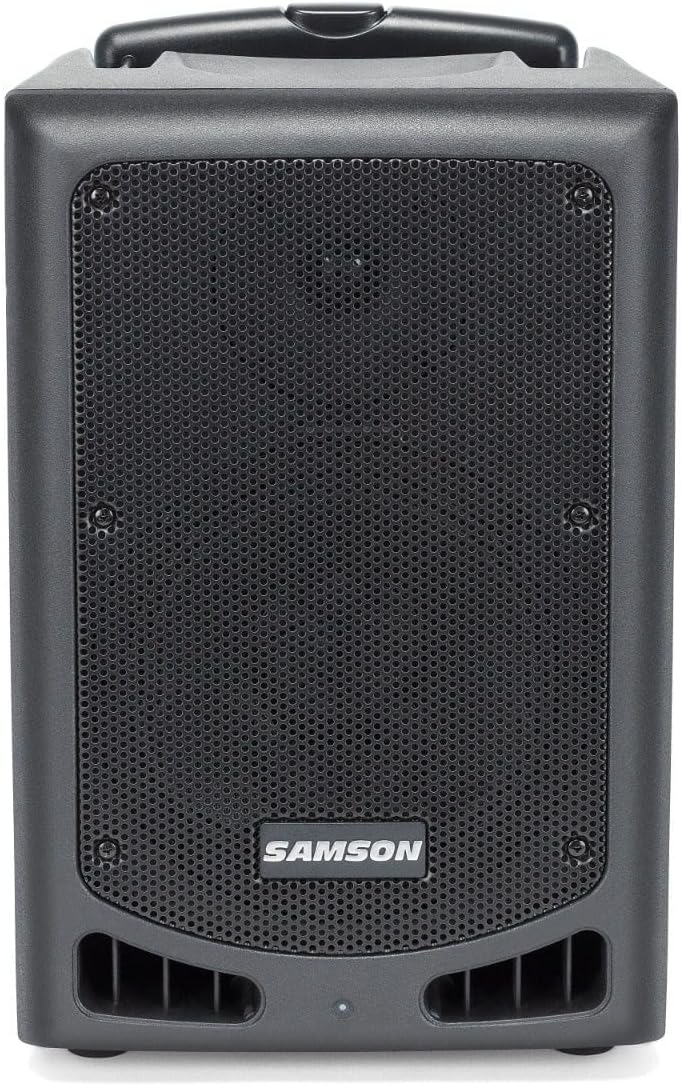 The Samson Expedition XP208w Rechargeable Portable PA is the perfect solution for anyone who needs great-sounding mobile audio. With 200 watts of power, 20 hours of battery life, a 4-channel mixer and Bluetooth audio, the XP208w offers big sound to musicians, DJs or those just hanging around the barbeque. The system includes a wireless handheld microphone for completely cord-free performance.Power and BuildThe XP208w operates for up to 20 hours continuously via its built-in rechargeable battery. Its lightweight amplifier delivers 200 watts of power to an 8" 2-way speaker system. All of this is housed in a rugged polypropylene enclosure with a steel grille, locking telescopic handle and smooth rolling wheels that weighs just under 24 pounds. Needless to say, transporting the XP208w is a breeze. Plus, a 1 3/8" speaker mount allows the XP208w to be mounted using any standard speaker stand.In The MixEquipped with a full-featured 4-channel mixer, the XP208w makes for quick and easy setup. Connect microphones, line-level devices, and for buskers, guitars directly to the XP208w. The speaker can also stream music wirelessly from any Bluetooth device. A variable reverb control adds depth, and a voiceover ducker automatically lowers the music when speaking or singing into a microphone (XLR or wireless inputs). In addition, a master 2-band EQ is provided to adjust the tonal characteristics of the XP208w, as is a line output to daisy-chain additional speakers.Wires, SchmiresIncluded with the XP208w comes a Samson XPD2 Handheld Digital USB Wireless System (with USB extension cable). And thanks to the inclusion of two USB wireless ports, you can integrate a second XPD Series wireless system (sold separately) for multi-performer vocal and speech applications.Features: All-in-one portable PA system that weighs just under 24lb Internal rechargeable battery for up to 20 hours of continuous use Bluetooth connectivity to connect wireless music sources Includes Samson XPD2 Handheld