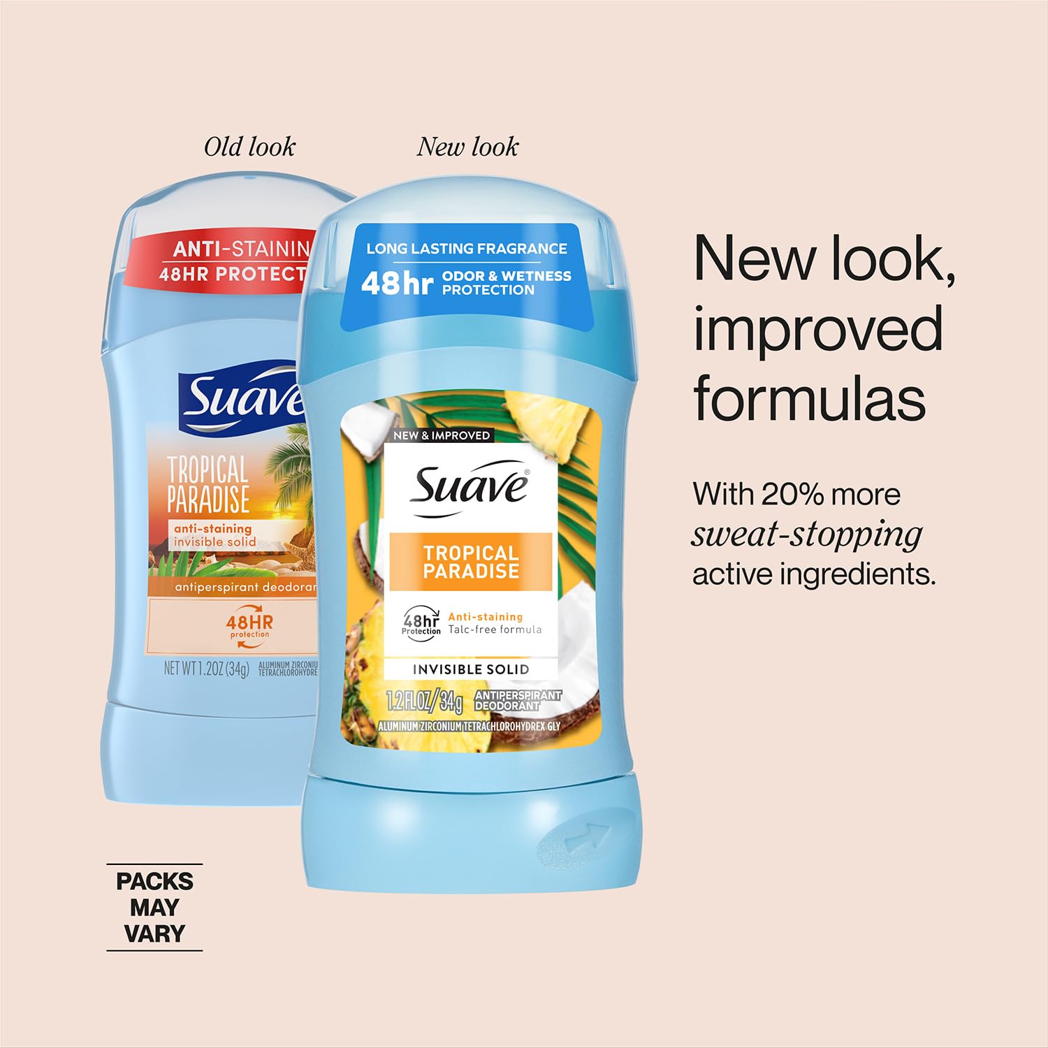 Experience the reliable freshness of a Suave Invisible Antiperspirant Deodorant Stick, expertly crafted to keep you feeling fresh and confident morning to night. The improved-formula deodorant delivers 48-hour protection against sweat and odor. Talc-free with 20% more “sweat-stopping” ingredients than our original formulation, our antiperspirant deodorant for women ensures maximum effectiveness without compromising comfort. The invisible, anti-staining female deodorant stick applies smoothly, leaving no white marks on your clothes, so you can wear what you love without worry. Committed to quality and accessibility, Suave empowers everyone to look, smell, and feel their best every day. For over 75 years, Suave has offered professional-quality haircare and skincare products for the entire family. The Suave mission is to make gold standard quality attainable to all, so everyone can look good, smell good, and feel good every day.