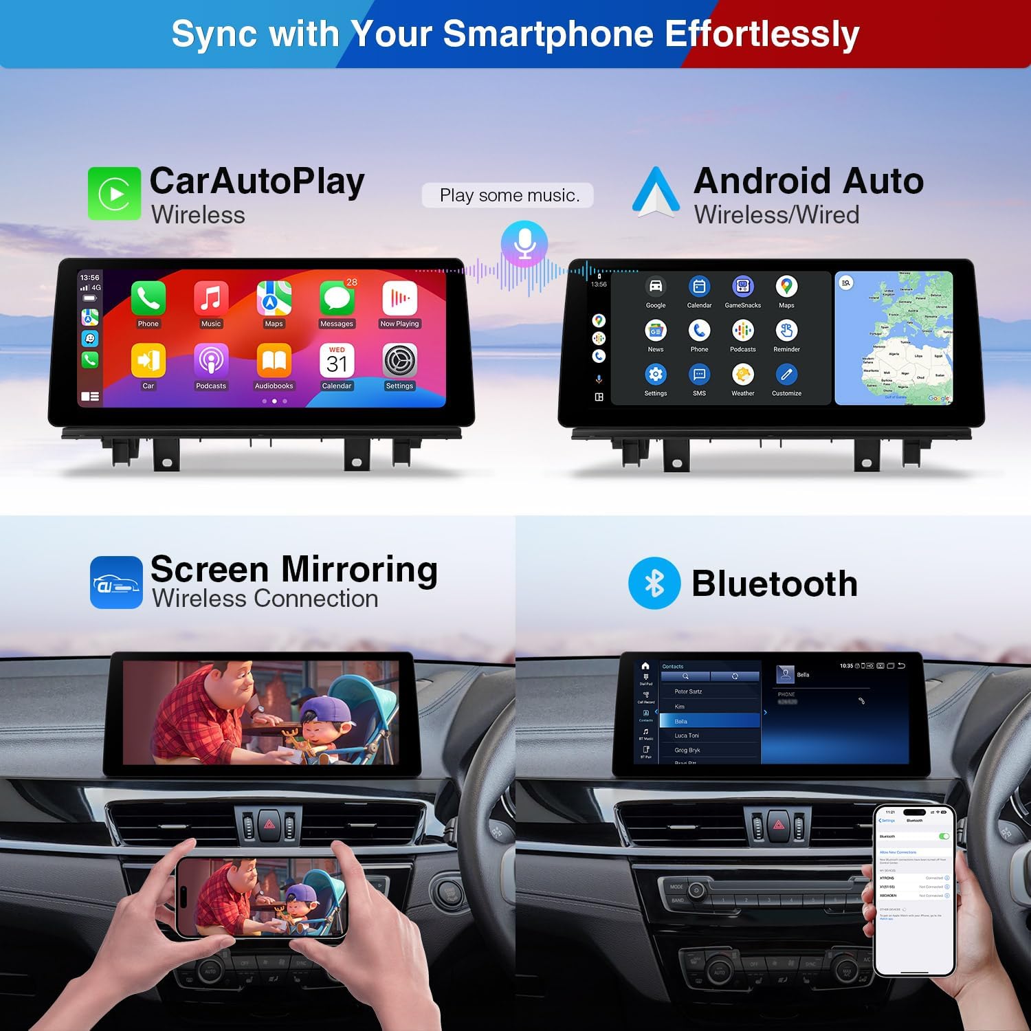 Applicable Models&Years For BMW X1 F48 (From 2018) with NBT EVO System Main Features ※Qualcomm Snapdragon 680 & Android 14 Octa-core with 8GB LPDDR4 RAM, 128GB Solid State ROM, Kyro 265 CPU ※1920*720 with 12.3” Touch Screen Upgrades your driving experience with supersized entertainment ※IPS Panel, 178°Viewing Angle Enjoy viewing on a big-screen stereo without eye fatigue or discomfort. ※Wireless Car Play & Wireless/Wired Android Auto Seamlessly displays compatible apps from your smartphone to the large screen for safer operations and get access to voice commands of Siri/Google Assistant directly from the head unit. ※Bluetooth 5.1 Enjoy more steady connections and higher-quality transmission for hands-free calls and music streaming. ※Dual Wi-Fi Band Connecting Work with 2.4GHz or 5GHz band, providing faster speed flexibility. ※Multi-task Display Simultaneous run two application like music and navigation on the 12.3“ IPS screen for easier multi-tasking. ※PIP-Picture in Picture Never miss a scene of your videos while you are switching to other apps on the car stereo. Optional Accessories Need OBD Function? B09D3DVZVR / B015MU8UN6 / B07X9JXV28 / B08HQ9LQ9X optional Need TPMS Function? B07WQFKV5G / B07DKB4GD2 optional Need External DVR? B07MBYCG4C optional Need Reversing AHD Camera? B00GY3BVT6 optionalAccessories: 1 x ISO Wiring Harness 1 x RCA Cable 1 x Audio Cable 1 x GPS Antenna 1 x 4G Antenna 1 x USB Cable 1 x Mini Speaker 1 x Tweezers 1 x Plastic Bracket 1 x User Manual 1 x Installation Instruction